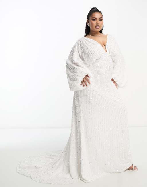 ASOS DESIGN Curve - Lennox - Trouwjurk met lovertjes, blousonmouwen en sleep in wit