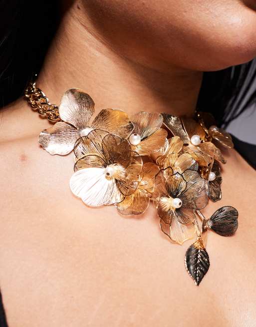 ASOS DESIGN Curve - Limited Edition - Ketting met meerdere bloemen van ijzerdraad in goudkleur