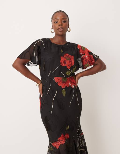 ASOS DESIGN Curve - Maxi jurk met burn-out patroon, engelenmouwen, ruches en opvallende bloemenprint