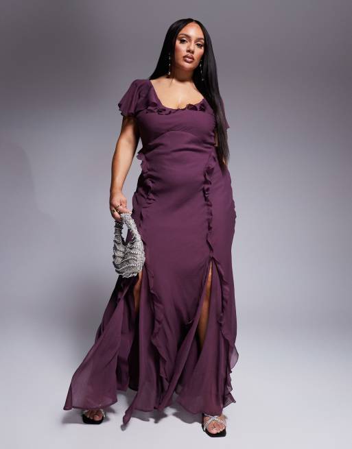 ASOS DESIGN Curve - Maxi jurk met godetplooien, fladdermouwen en ruches in aubergine
