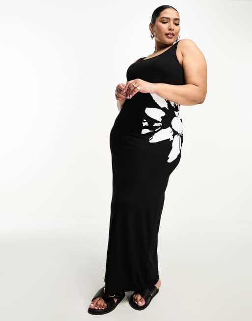 ASOS DESIGN Curve - Maxi jurk met lage ronde hals en bloemenprint in zwart