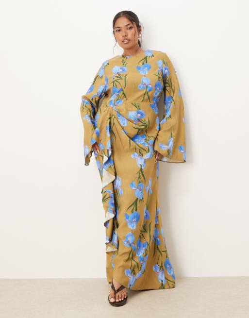 ASOS DESIGN Curve - Maxi jurk met lange fladdermouwen, rok met ruches en oversized bloemenprint in groen