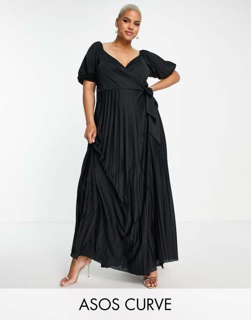 ASOS DESIGN Curve - Maxi-jurk met pofmouwen en aangerimpelde voorkant in zwart - BLACK