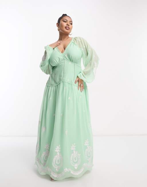 ASOS DESIGN Curve - Maxi jurk met V-hals, open achterkant, borduursels en detail op de randjes in groen