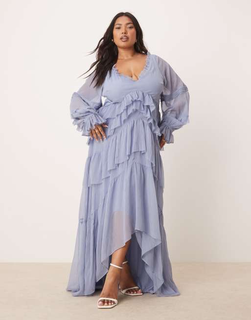 ASOS DESIGN Curve - Maxi jurk met V-voorkant, stroken, ruches, ongelijke zoom en platgestikte plooitjes in oudblauw