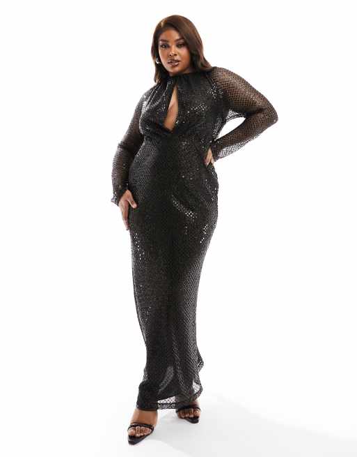 ASOS DESIGN Curve - Maxi-jurk van doorschijnend mesh met lovertjes, gedrapeerd lijfje en body in zwart