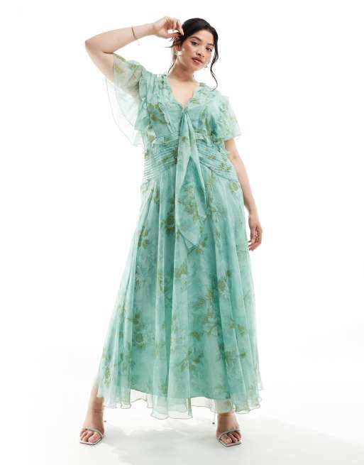 ASOS DESIGN Curve - Midi-jurk met fladdermouwen, gestrikte voorkant en bloemenprint in saliegroen