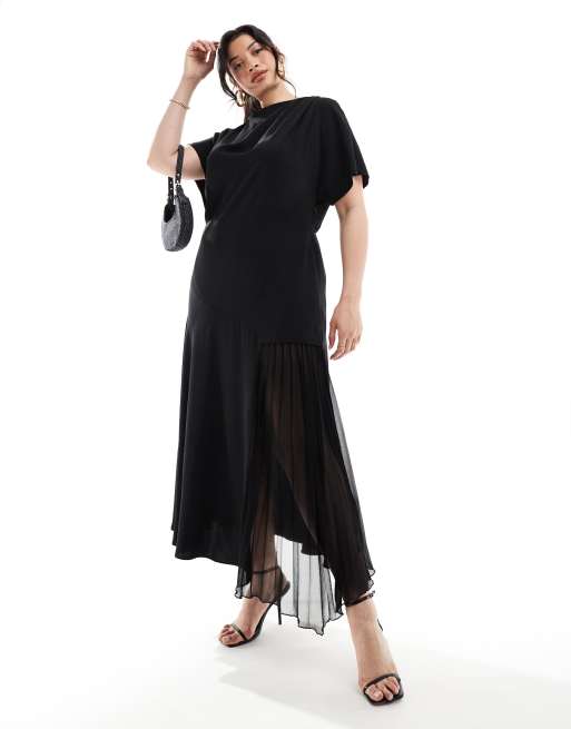 ASOS DESIGN Curve - Midi jurk met gedrapeerde halslijn en asymmetrische geplooide zoom in zwart