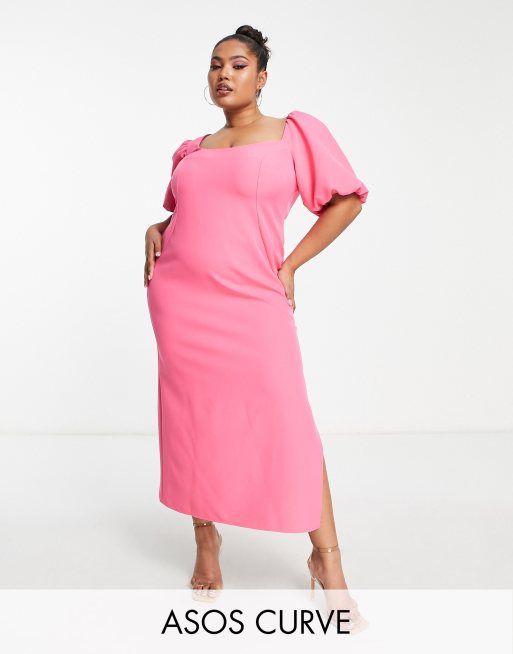 ASOS DESIGN Curve - Midi jurk met pofmouwen en asymmetrische halslijn in felroze
