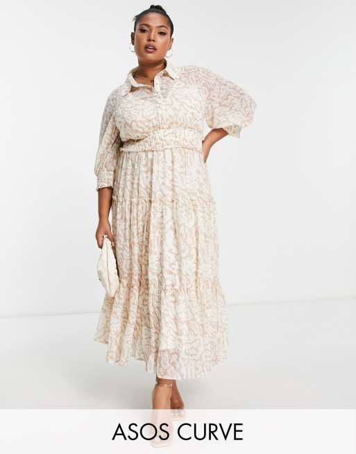 ASOS DESIGN Curve - Midi jurk met stroken, kraagje, gesmokte taille en dierenprint in naturel
