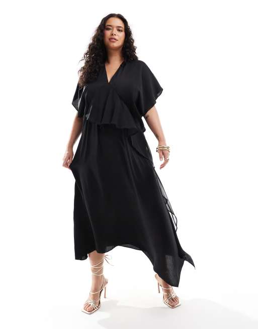ASOS DESIGN Curve - Midi jurk van satijn met asymmetrische ruches in zwart