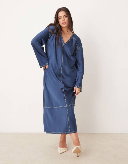 ASOS DESIGN Curve - Midi-jurk van satijn met V-hals en contrasterende stiksels in blauw
