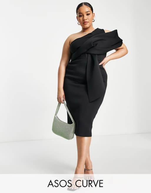 ASOS DESIGN Curve - Midi-kokerjurk met gedrapeerde mouw met blote schouder in zwart
