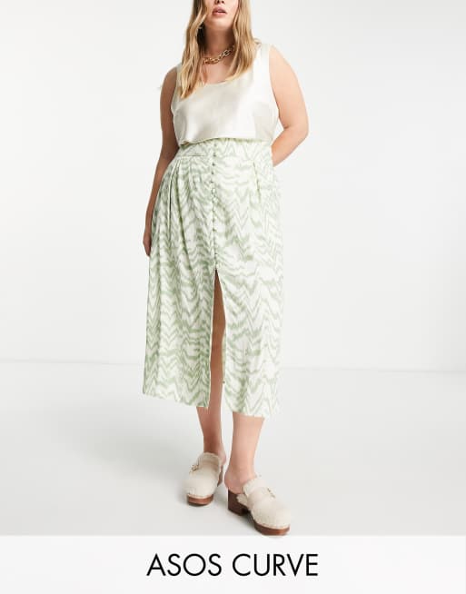 ASOS DESIGN Curve - Midi rok met knoopsluiting en split in saliegroene en witte zebraprint