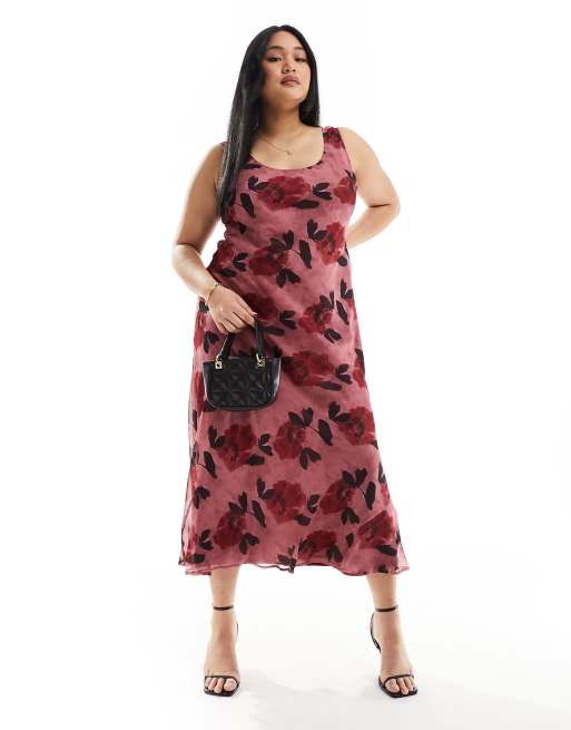 ASOS DESIGN Curve - Midi slipdress van chiffon met lage ronde hals en print in roze