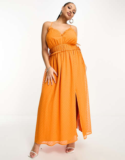 ASOS DESIGN Curve - Midi-slipdress van dobbystof met ruches bij elastische taille in oranje