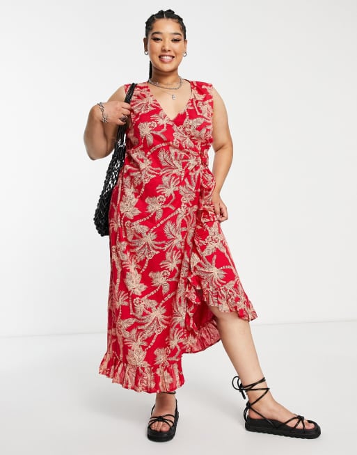 ASOS DESIGN Curve - Midi-sundress van kreukelstof met overslag en gesp in rode palmprint