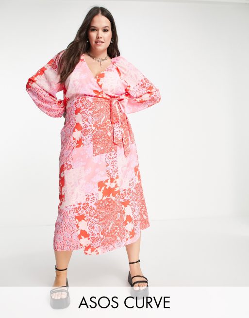 ASOS DESIGN Curve - Midi-wikkeljurk met strikceintuur en patchworkprint in lila en rood