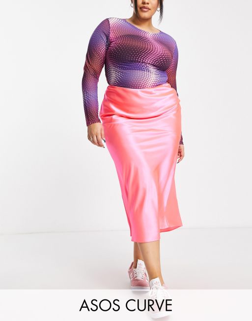 ASOS DESIGN Curve - Midirok van schuin gesneden satijn in neonroze