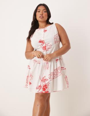 ASOS DESIGN - Curve - Mini jurk met rechte hals, verlaagde taille en knopen in rode bloemenprint