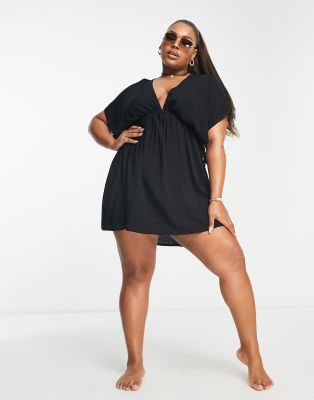 ASOS DESIGN Curve - Mini strandjurk met fladdermouwen en aangerimpelde, gestrikte taille in zwart