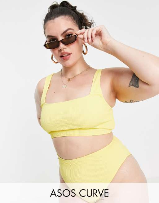 ASOS DESIGN Curve - Mix en match - Gekreukt bikinibroekje met hoge taille in geel