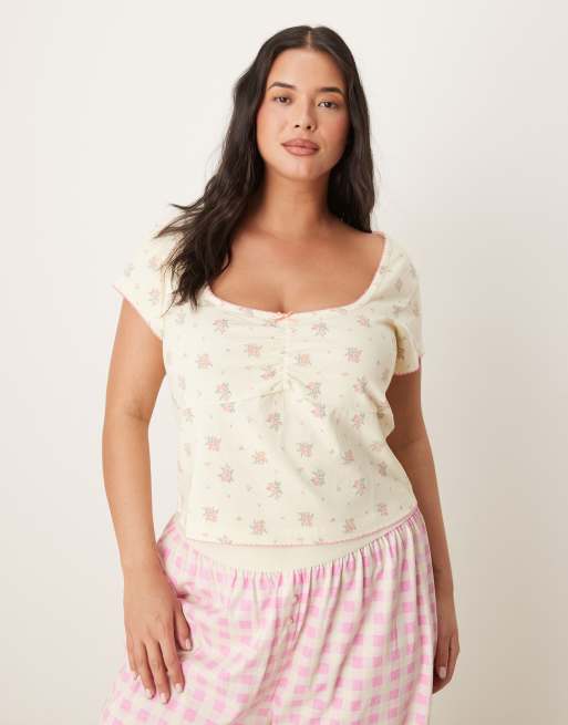 ASOS DESIGN Curve - Mix en match - Pyjamatop in melkmeisjesstijl in lichtgeel met fijne print