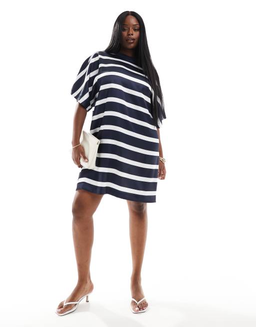 ASOS DESIGN Curve - Oversized gestreepte satijnen mini T-shirtjurk in marineblauw