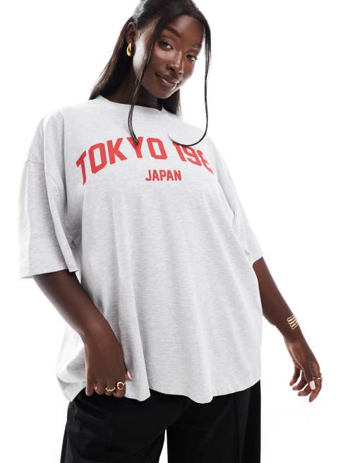 ASOS DESIGN Curve - Oversized T-shirt met bolle Tokyo-print in gemêleerd ijsgrijs