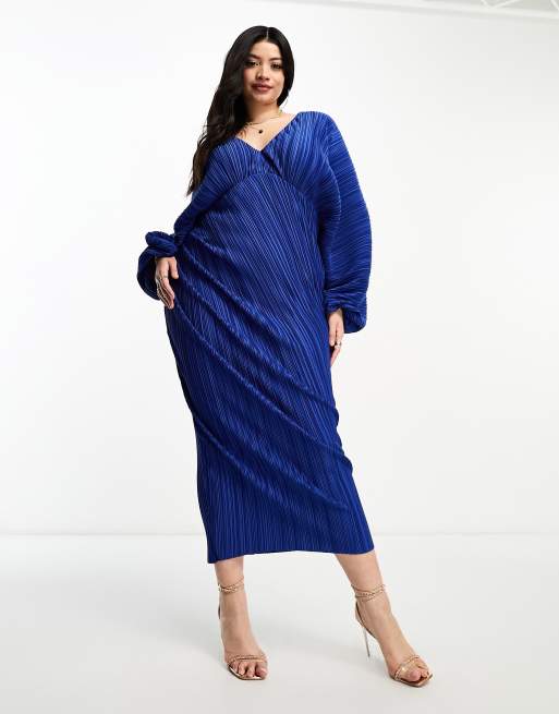 ASOS DESIGN Curve - Plissé midi jurk met diep decolleté en blousonmouwen in blauw