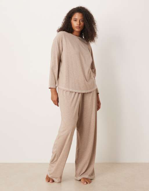 ASOS DESIGN Curve - Pyjamaset met lange mouwen en broek met wijde pijpen in gemêleerd bruin