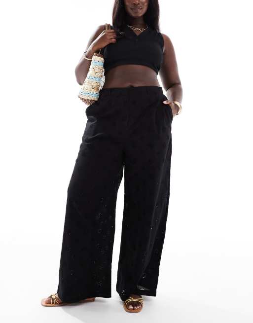 ASOS DESIGN Curve - Ruimvallende broek van broderie met rechte pijpen in zwart
