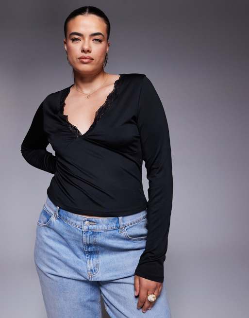 ASOS DESIGN Curve - Soepele top met V-hals, lange mouwen en kant in zwart