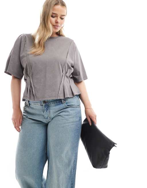 ASOS DESIGN Curve - T-shirt met naaddetail, korte mouwen en korsettaille in grijs met wassing