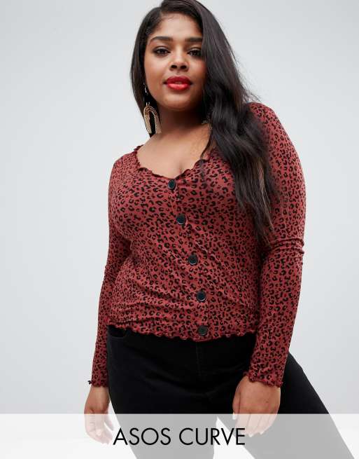 ASOS DESIGN - Curve - Top met knopen aan de voorkant, lange mouwen en luipaardprint