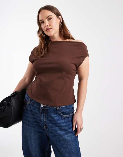 ASOS DESIGN Curve - Top van katoen met blote schouders in chocoladebruin