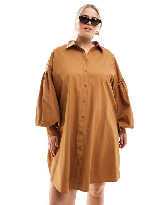 ASOS DESIGN Curve - Ultieme boyfriend mini-overhemdjurk met volumineuze mouwen in bruin