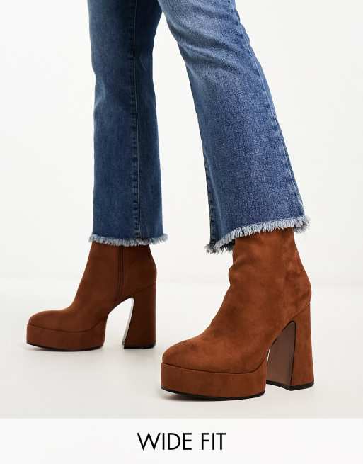 ASOS DESIGN - Enchant - Laarzen met hak, plateauzool en brede pasvorm in bruine micro