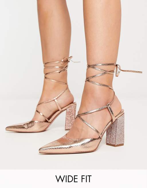 ASOS DESIGN - Pandi - Sandalen met hoge blokhak, versiering, strikbanden en brede pasvorm in roségoud