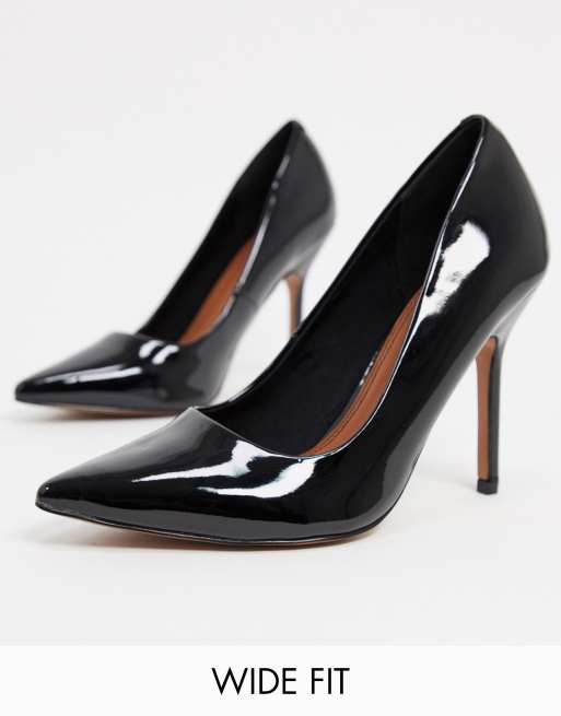 ASOS DESIGN - Phoenix - Puntige pumps met hoge hak en brede pasvorm in zwart lakleer