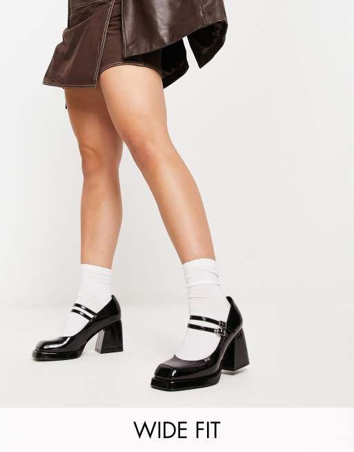 ASOS DESIGN - Sully - Mary Jane-schoenen met brede pasvorm, halfhoge hak en plateauzool in zwart lakleer