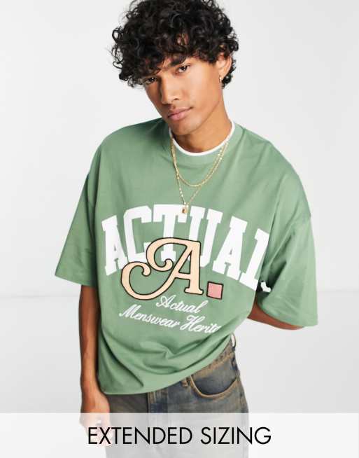 ASOS Actual - Oversized T-shirt van badstof met logo en gekleurde randje om de hals in groen