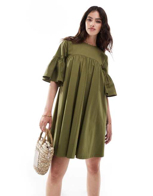 ASOS DESIGN - Aangerimpelde mini-jurk met oversized mouwen in olijfgroen