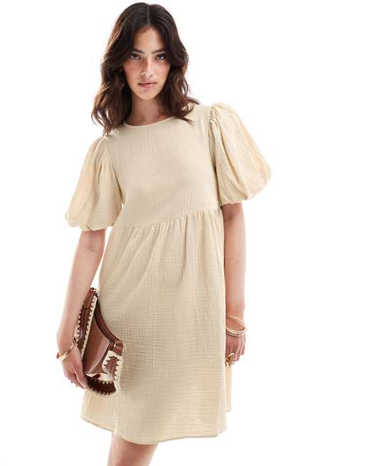 ASOS DESIGN - Aangerimpelde mini jurk van dubbele stof met pofmouwen in wit
