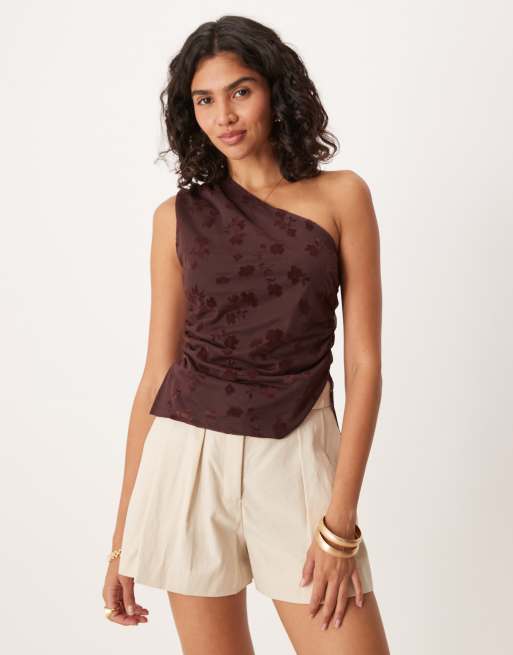 ASOS DESIGN - Asymmetrisch gedrapeerde flocked top met burn-out van doorschijnende gebloemde stof in bruin
