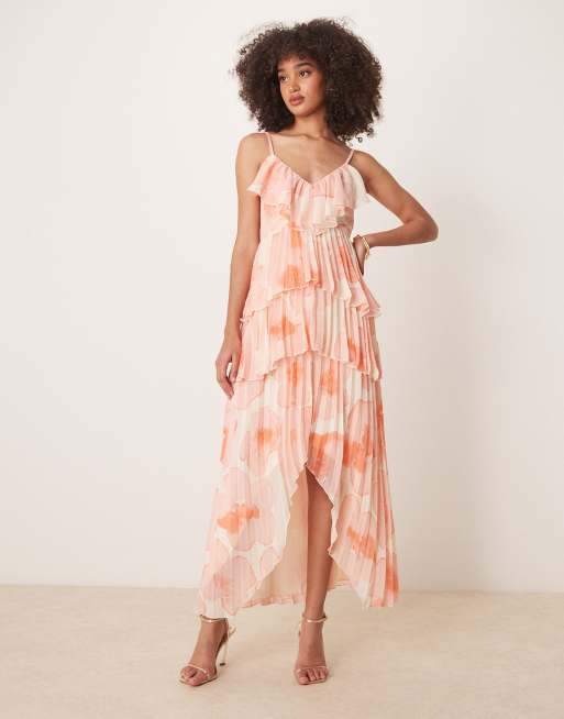 ASOS DESIGN - Asymmetrische geplooide jurk met gelaagde ruches in aquarel bloemenprint