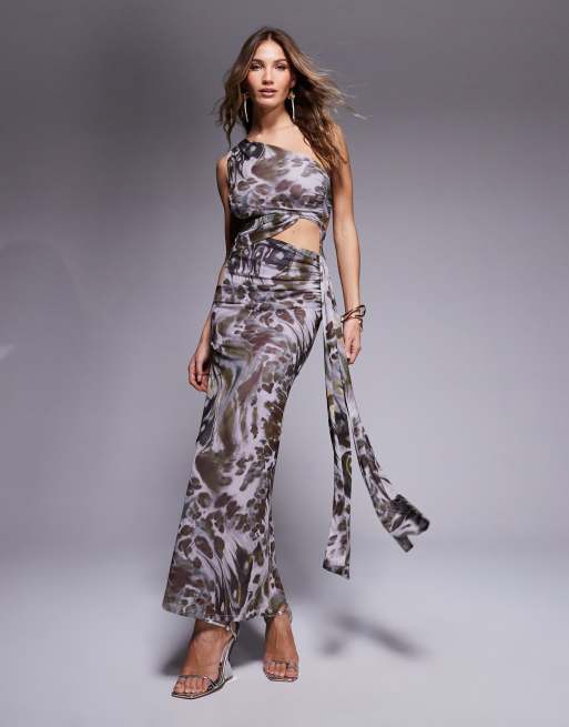 ASOS DESIGN - Asymmetrische midi-jurk van mesh met blote schouder en lange strikken in abstracte wervelprint