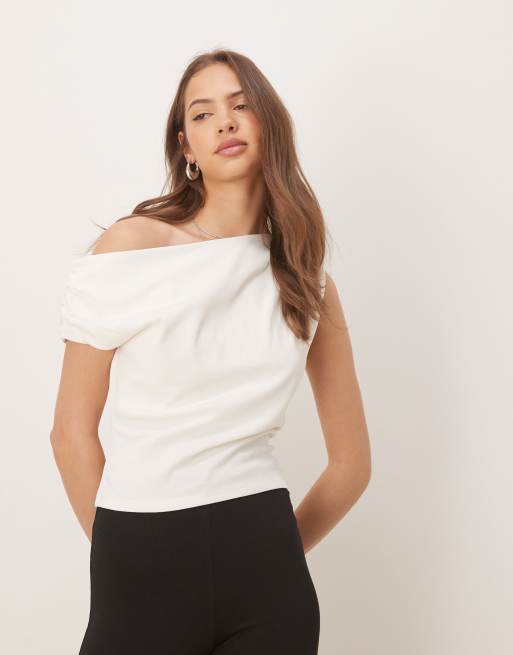ASOS DESIGN - Baby T-shirt met blote schouders en rimpeleffect in kokosmelkwit