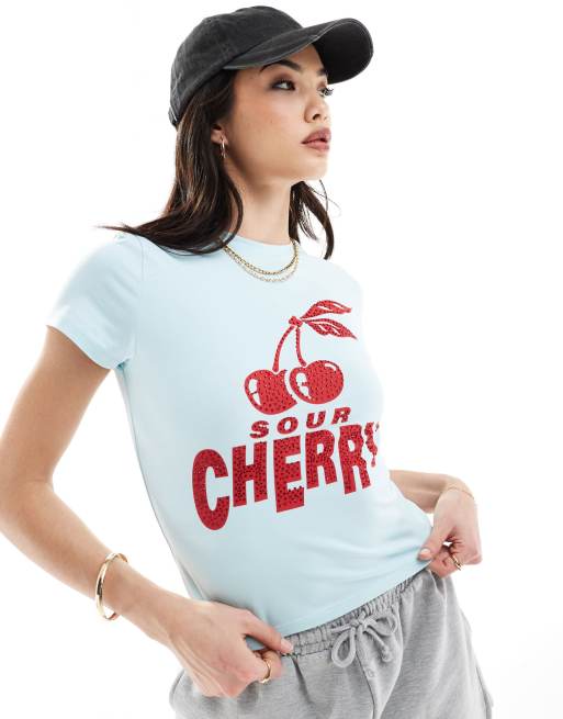 ASOS DESIGN - Baby-T-shirt met grafische Sour Cherry-print met siersteentjes in blauw