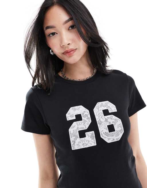 ASOS DESIGN - Baby-T-shirt met kantprint van het nummer 26 in zwart